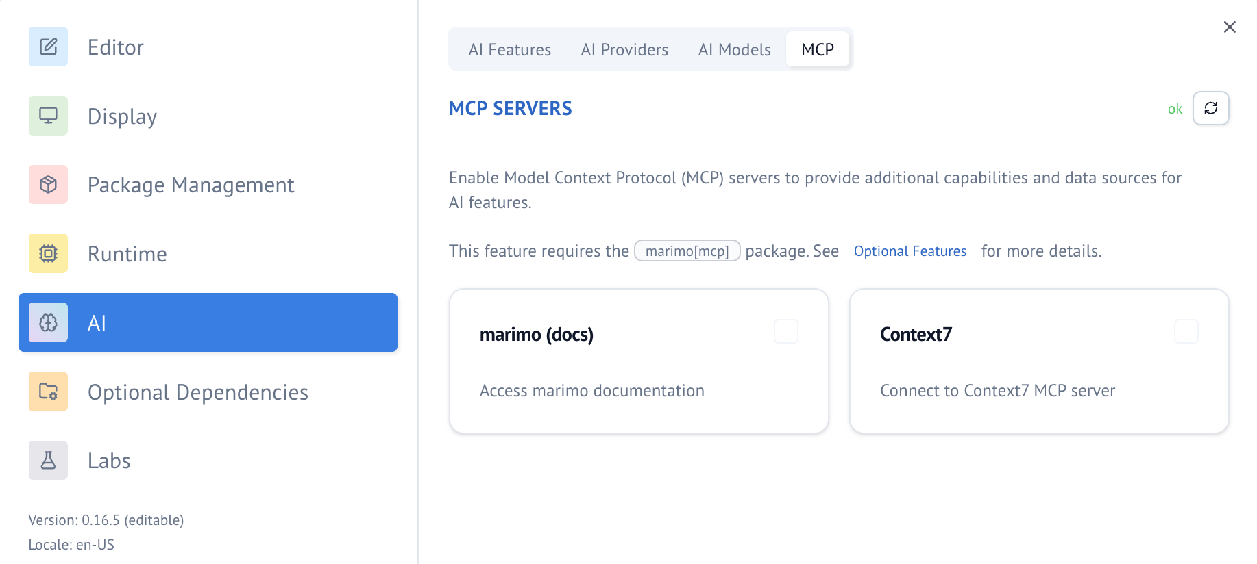 Enable MCP client servers through the marimo settings UI: